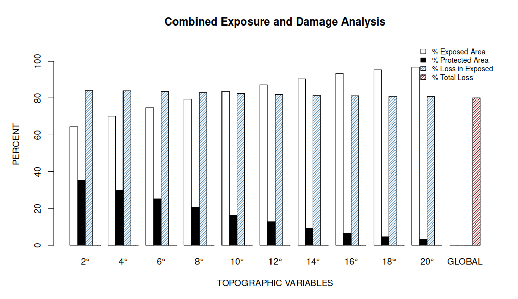 De plus, dans cet article, les auteurs mentionnent un angle de 20° (angle d’ouverture de canopée) qui serait utilisé aussi en Jamaique par Boose et al. (1994). J’ai donc regardé le % de zones exposées, de zones protégées ainsi que le % de dégâts en fonction de la zone dans laquelle elle se situe (exposées ou protégée)