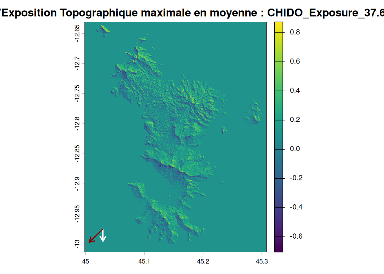 Sur le cas du cyclone Chido, j’ai récupéré l’exposition topographique au vent pour chaque mesure prise dans mon loi (location of interest) qui est la zone de Mayotte (~300km). Cette exposition topographique est décrite comme une variable quantitative “Exposure” et peut être lue comme un indice d’exposition au vent pour chaque cellule d’une grille (un raster). Les valeurs négatives représente les aires protégées du vent tandis que les valeurs positives représente les aires exposées au vent.