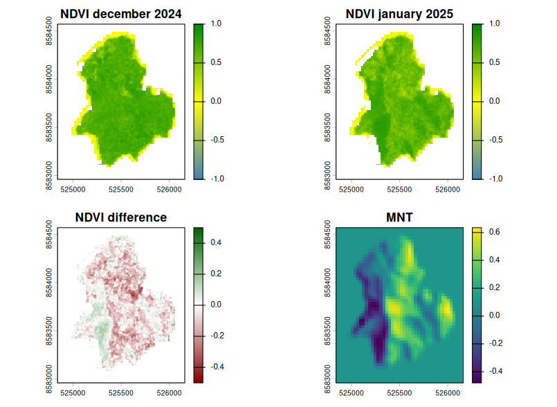 Les cartes de différences de NDVI sont disponible dans le fichier images brutes. Il y a les cartes de différences entre données provenant de la même période et entre données de périodes différentes.