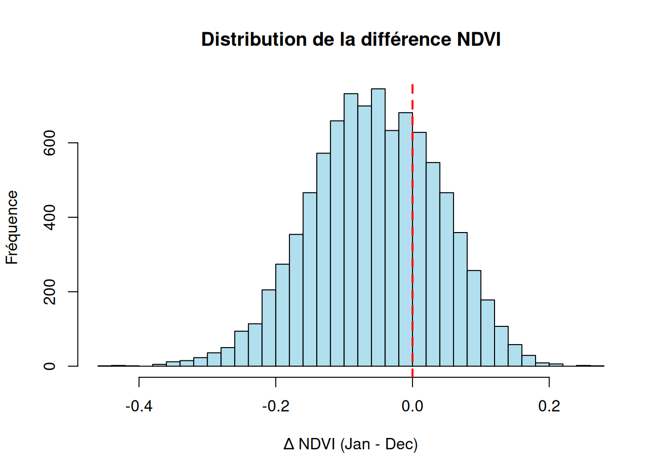 xlab="Δ NDVI (Jan - Dec)", ylab="Fréquence")