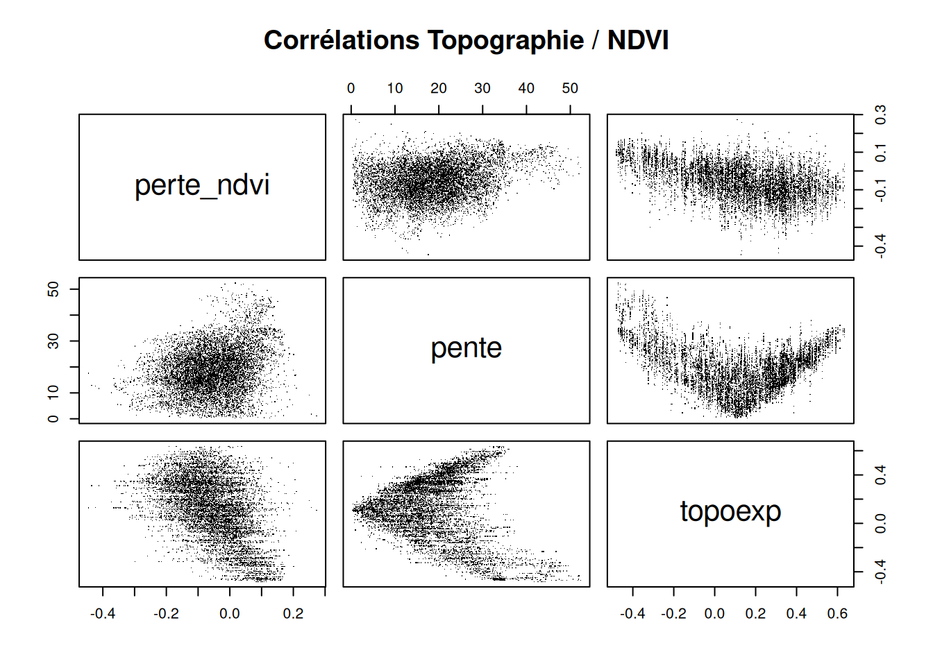 pairs(dtaMbouzi[, c("perte_ndvi", "pente", "topoexp")],