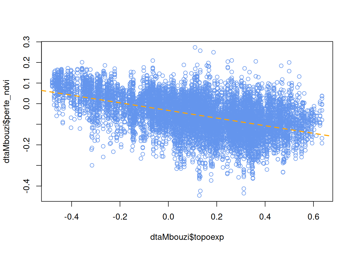 abline(lm(perte_ndvi ~ topoexp, data = dtaMbouzi), col = "orange", lwd = 2, lty = 2)