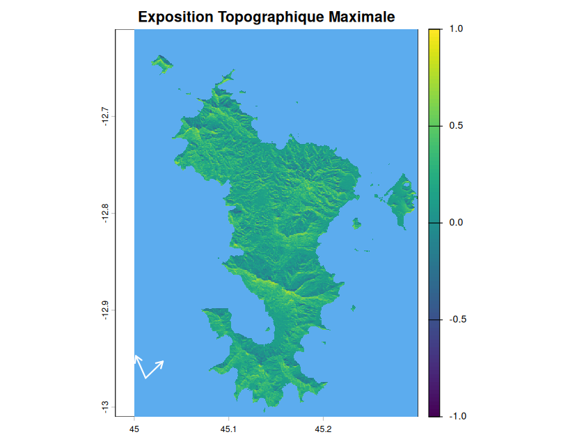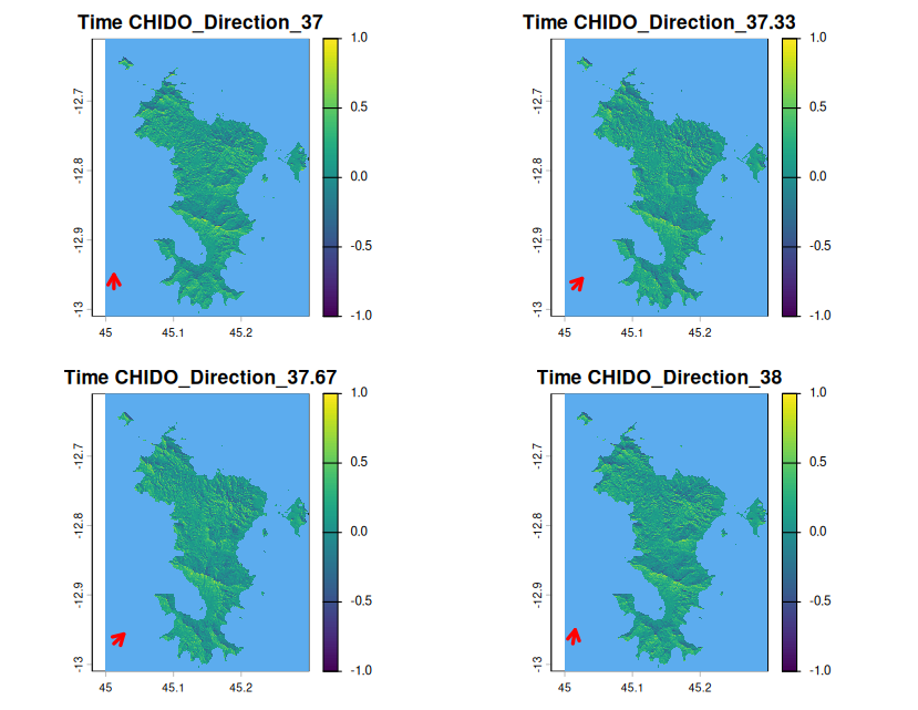Pour les outputs récapitulatifs c’est-à-dire l’exposition maximale de chaque cellule du raster et l’exposition moyenne de chaque cellule du raster, les flèches correspondent à l’étendue des vents sur tout le long du cyclone.